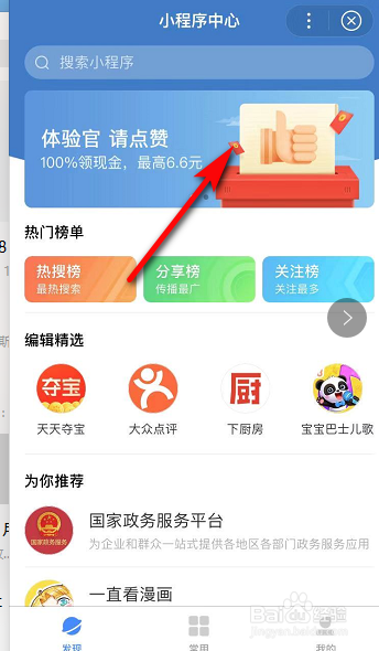 进入小程序中心,单击搜索栏下的【体验官。请点赞】。
