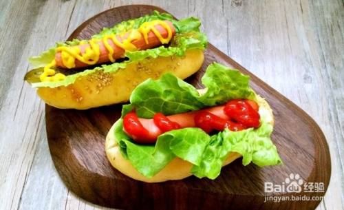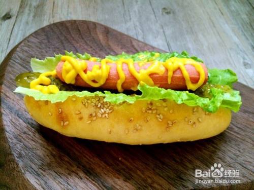 面包正面切开2/3(不要切断)加生菜,酸黄瓜,烤好的香肠,浇黄芥酱,或番茄酱。不怕麻烦的同学可以用黄芥酱+蛋黄酱+蜂蜜按照1:1:1配比后,再用裱花袋挤出来。