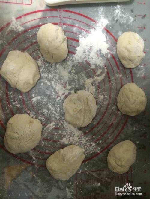 用少许干粉,将面团排气后,放松,分成8个大小相等的面团。