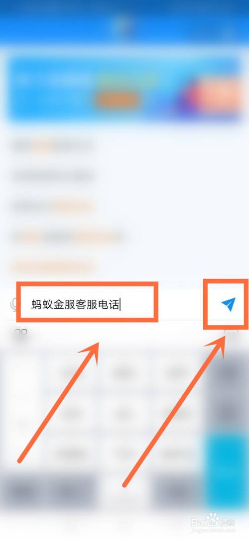 接着,在对话框内,输入【蚂蚁金服客服电话】,并点击【发送图标】进入。如下图所示