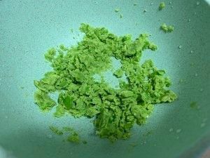 锅中水烧开,放入豌豆煮1分钟后捞出,稍晾凉后去掉豌豆皮,碾碎豌豆