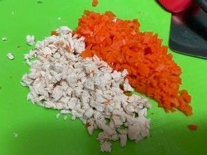 锅中烧开水,胡萝卜煮5分钟后捞出,鸡肉煮三分钟后捞出。将胡萝卜和鸡肉剁碎