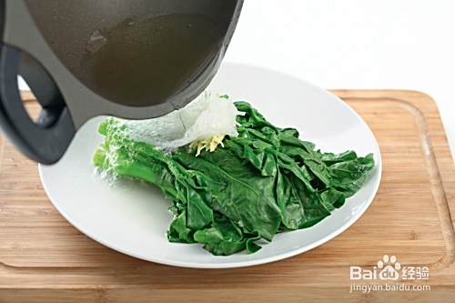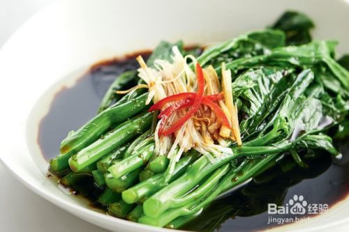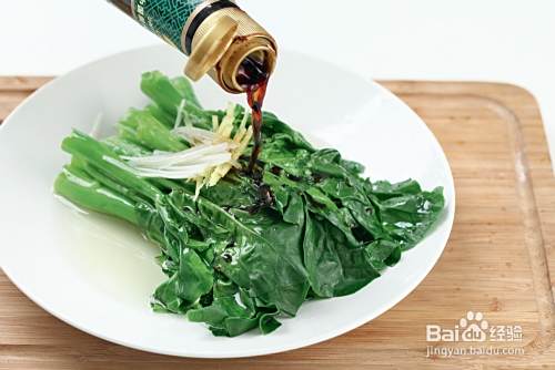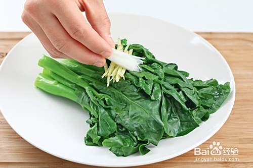 将各5g葱姜切成细丝,放在汆烫好的芥兰上