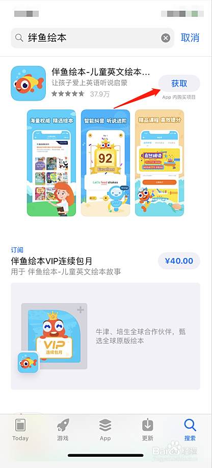 3.在搜索框内输伴鱼绘本点搜索,界面上显示伴鱼绘本,点旁边的<获取>就可。