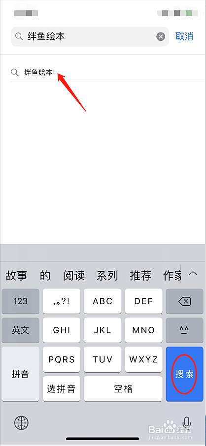 然后进入搜索界面,在搜索框内输入伴鱼绘本的文字内容,点击搜索。