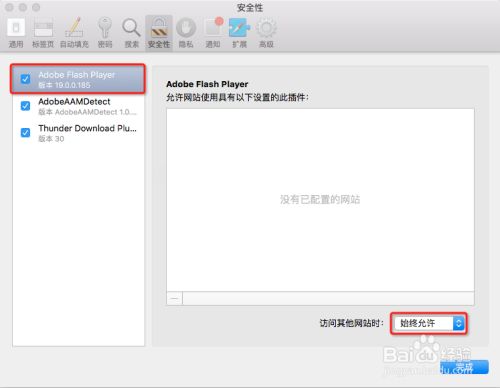 这里选择“Adobe Flash Player”,将下面的选择给成“始终允许”
