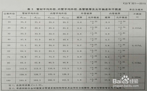 1)外管(铝合金管)铝合金外管由6063航天变形铝合金材料经热挤压成型的无缝圆管,与内管经预应力复合成一体。兴纪龙铝合金衬塑复合管材是具有一定结构强度的金属衬塑复合管材,由于其独特的轻质刚性的结构质量强度,而被广泛应用于各类(尤其是高层、超高层、钢结构)建筑体的明装、暗装的干管、立管和支管,铝合金衬塑复合管材的-外管(即:外层铝合金管)壁厚直接决定了管材的结构强度(即:管材环刚度),是保障铝合金衬塑复合管材结构强度长期安全应用的核心要素。 因此,国家标准对各规格铝合金衬塑复合管材的外管(铝合金管)壁厚有严格的规定要求,如下图: