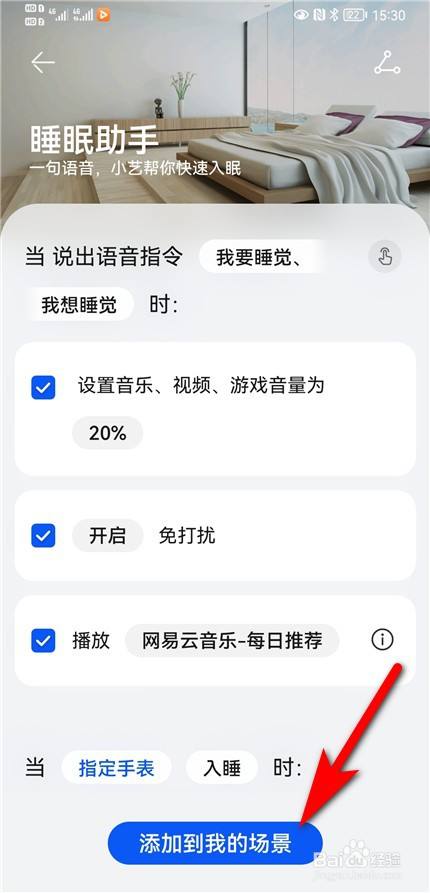 华为手机可以设置睡眠模式,打开智慧生活,在场景页面,设置睡眠模式即可,以下是具体操作步骤:
