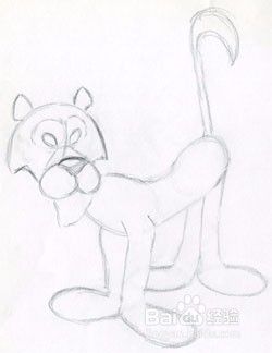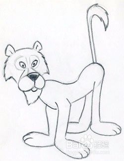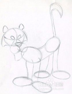 现在,让我们画出身体的其余部分。画出所有四条腿和尾巴。注意尾巴是如何创建身体姿势的主要口音的。在老虎头的两侧加上耳朵和胡须。