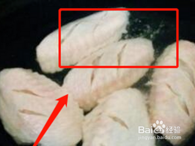 鸡翅清洗干净以后,用刀在鸡翅两侧划两道口,生抽加一些水,再放进去姜丝,准备腌鸡翅。