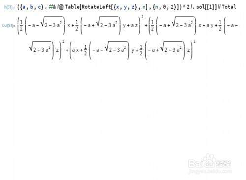 (({a,b,c}.#&/@Table[RotateLeft[{x,y,z},n],{n,0,2}])^2/.sol[[1]]//Total)/.a->0