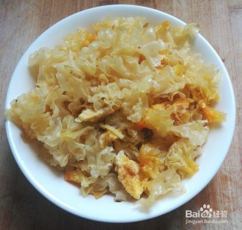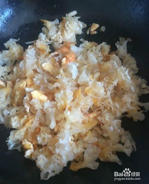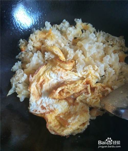 再放入前面备好的蛋饼,用锅铲将蛋饼铲成小块,吸收银耳里的水分。很快一份美味的银耳炒蛋就做好啦!