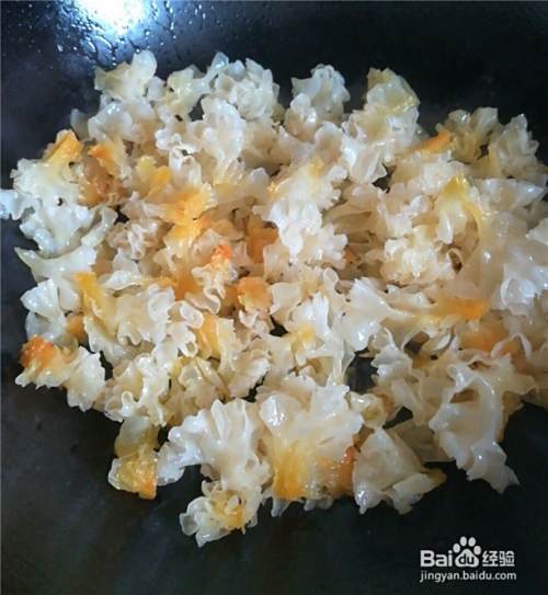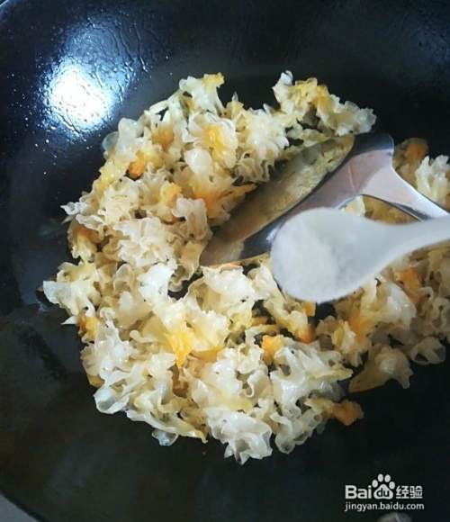 待上面的佐料爆香后,倒入银耳,中火翻炒2-3分钟后,放盐并翻炒均匀。