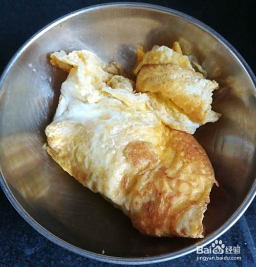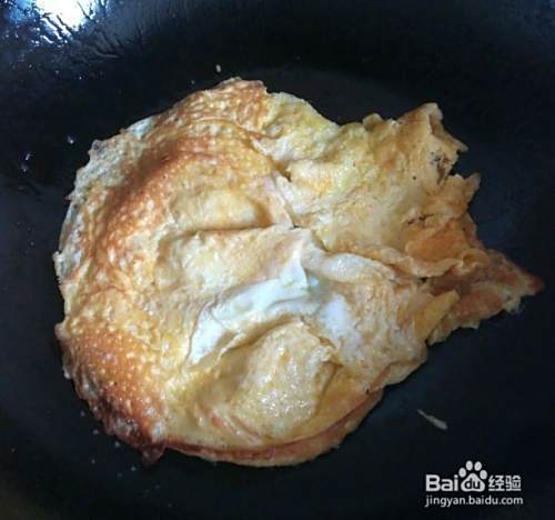 开中火后,热锅里下油,油热后倒入蛋液,一面煎起皮来后,再煎另一面。