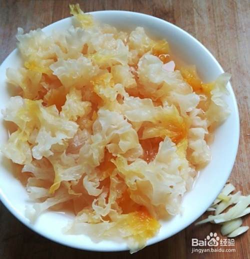 首先是提前泡发银耳,用不了多久,小小的一朵银耳吸收水分后,就涨开如绣球了。