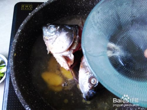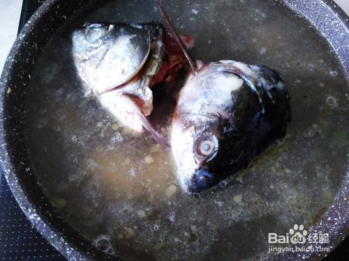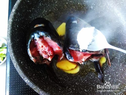 然把清理干净的鱼头放进去,加适量的盐翻炒一下。