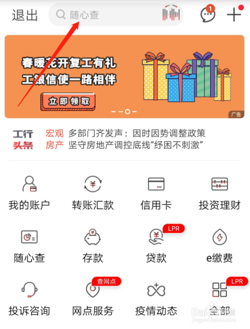 首先在手机上下载中国工商银行APP,打开并登陆自己的账号,如图所示点击搜索框。