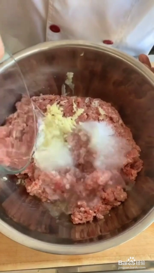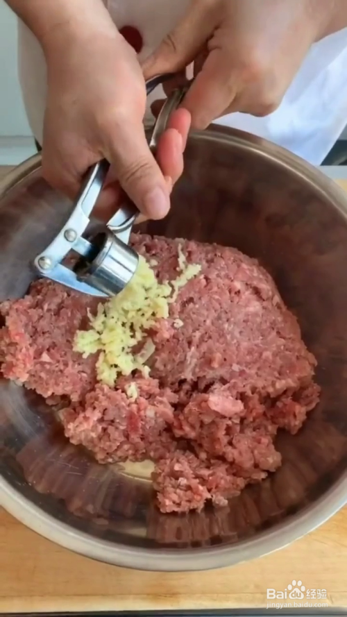 我们将猪肉剁成较为细腻的肉馅,再加入蒜末,盐,白糖,味精,清水,淀粉和香肠腌料