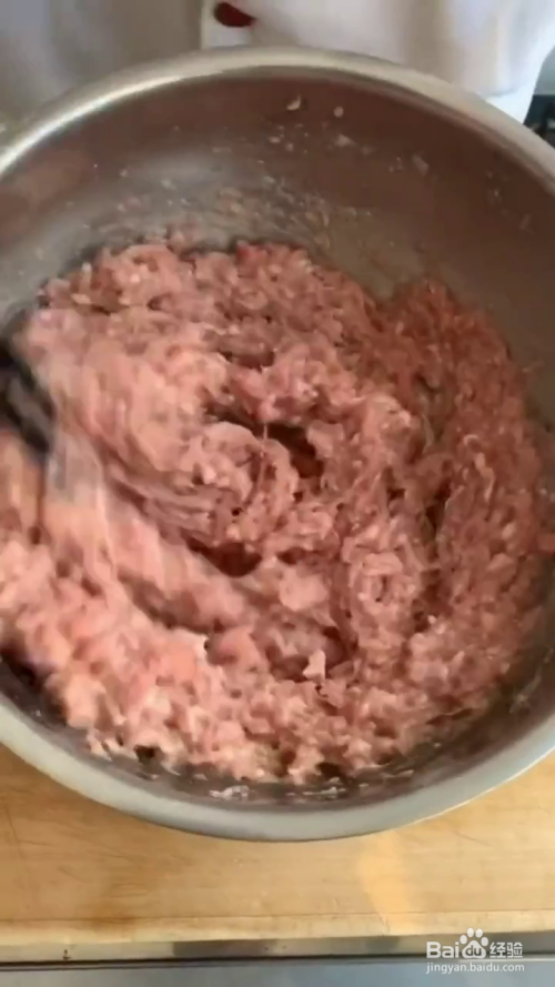 顺着一个方向不断地搅拌上劲,将肠衣提前泡好,用工具将肉馅灌入肠衣中