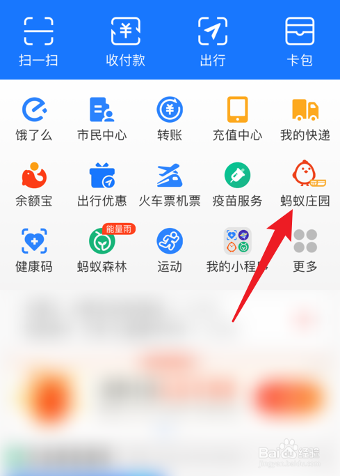 打开支付宝界面,点击“蚂蚁庄园”入口。
