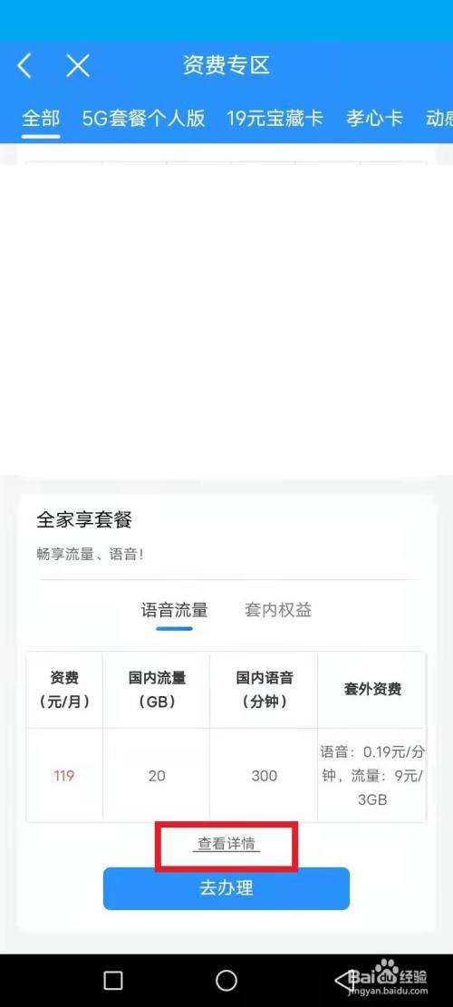 手机打开中国移动软件,切换所属城市,选择套餐全部资费公示,找到119元全家享,查看该套餐详情介绍。