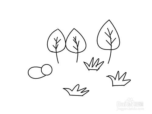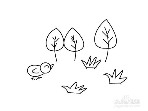 小鸡喜欢在小树和小草丛里找食物,那怎样画小树小草和小鸡呢?下面我们和小朋友们一起来学习画一画吧。