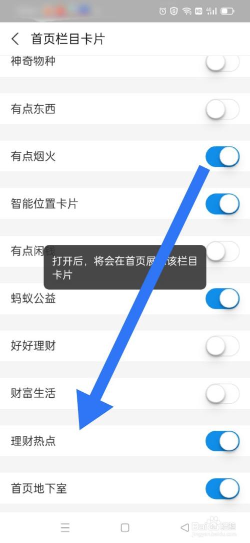 在“首页栏目卡片”页面,点击“理财热点”开启即可。