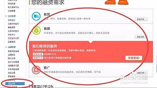 在“您的融资需求”中可以看到三种贷款方式,有“备货”、“账期”和“推广”三种,可以选择自己需要的贷款形式,这里淘宝会根据你的账户的等级和信用情况给予贷款的额度。
