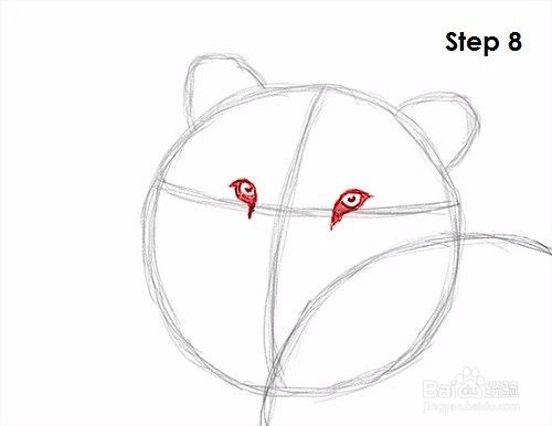 第8步:使用相交线作为放置指南,绘制老虎的眼睛。眼睛形状像足球,每个球内有两个眼球,用于眼球和瞳孔。用一个黑色的轮廓围绕在眼睛的下方。