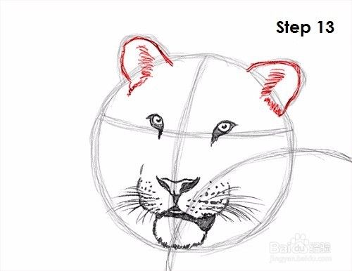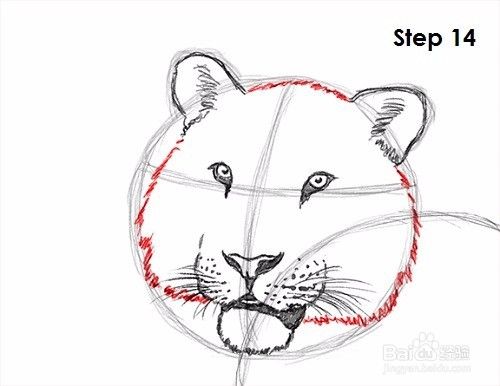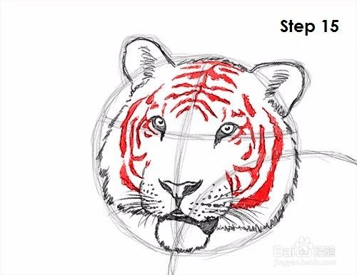 第14步:在圈子周围使用快速,短的笔画来绘制虎的头部。