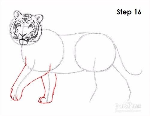 第16步:用初始线条作为向导画出老虎的前腿。通过使用快速短行程围绕线条来绘制腿部以使其变得毛茸茸。首先轻轻画画。当你喜欢你所拥有的东西时,继续前进并使其变暗。