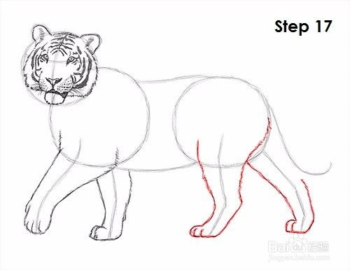 步骤17:使用相同的技术绘制老虎的后腿。首先,通过轻描淡写来环绕线条。然后使用快速短行程使其变暗。