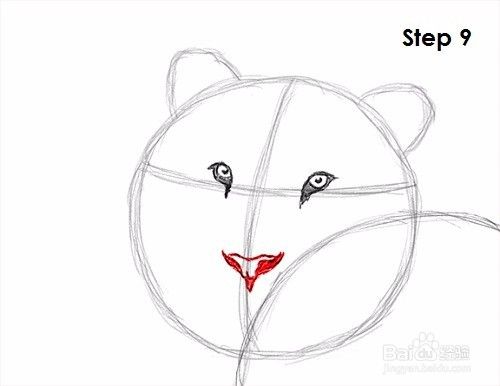 第9步:画出老虎眼睛下方的鼻子。鼻子类似于倒置的三角形,鼻孔的阴影边。