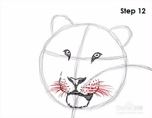 第12步:在枪口顶部的老虎鼻子下面画出点,并为胡须画出快速,短的行程。
