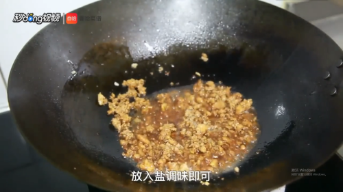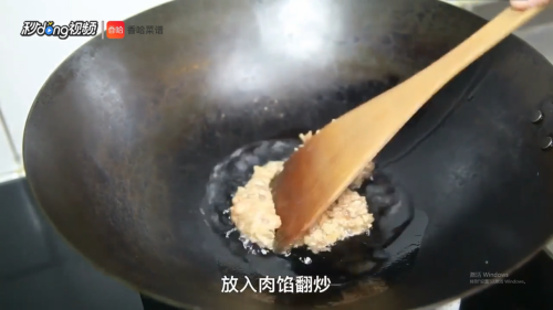 肉馅中放入酱油、料酒、葱、姜、盐和味精搅拌。