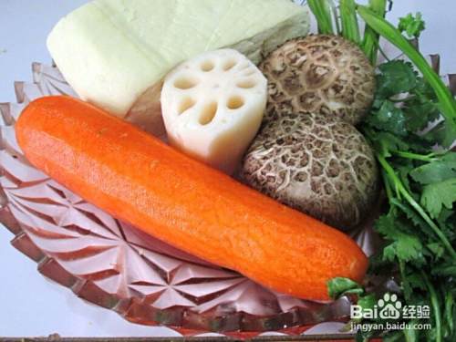 将胡萝卜 香菇 莲藕 香菜洗净切成碎。