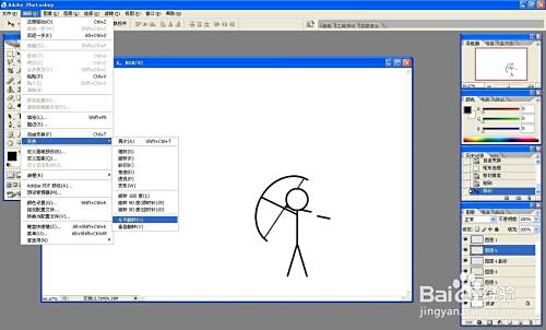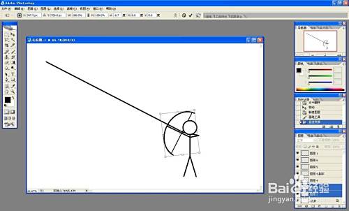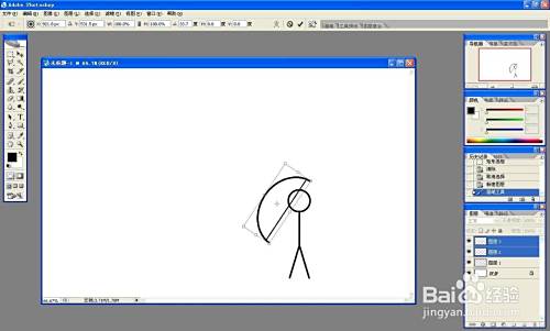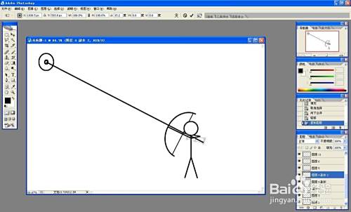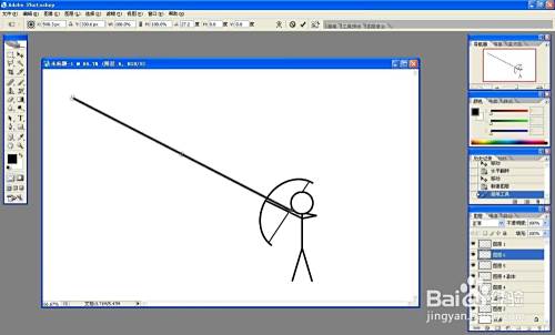 新建图层,用圆选框画一个椭圆,描黑色边,用方选框选中差不多一半的圆,按delete删除,作为弓。新建图层,画一条直线,作为弦。选中弓、弦图层,按ctrl+t同时旋转两个图形,移动到小人处。