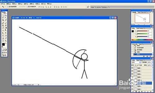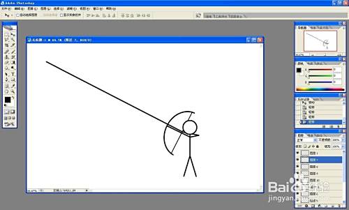 新建图层,画一条斜射向远处的线,作为箭,根据箭的角度调整弓、弦、手臂的角度。用多边形选框将斜线分成从短到长的一段一段的线,然后仍然移动到原来的位置,重新组成长斜线。