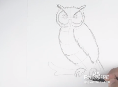 画出猫头鹰头部的细节。画出下巴、喙、眼睛和耳朵。继续用曲线塑造猫头鹰的身体。