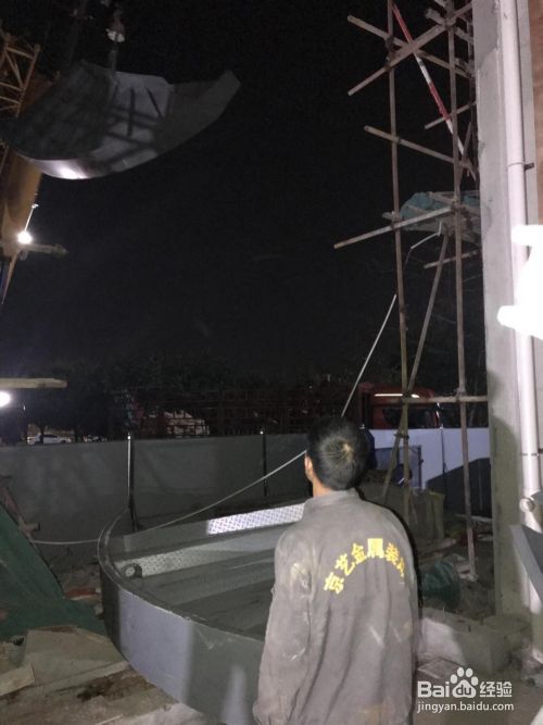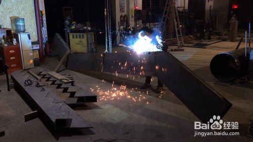 对楼梯进行焊接、组装。从两侧开始固定箱型结构梁的位置,用辅助钢管作为支撑,在上面焊接踏步钢板,最后再进行内弧箱型结构梁的固定与组装。