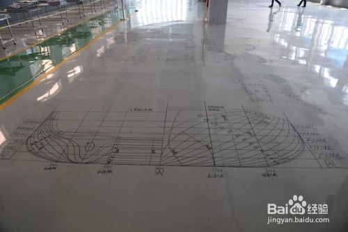 由经验丰富的技术工人进行放样工序。根据确认后的图纸尺寸,技工师傅在操作平台上绘制出等比例楼梯图案。