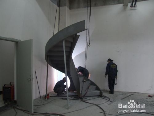 定点完成后,在楼梯起步位置安装预埋铁和化学锚栓。先用吊机将楼梯第一段摆放安装到位。在楼梯下方增设辅助钢管,为的是后面楼梯焊接时不会因为过热而产生变形的现象。