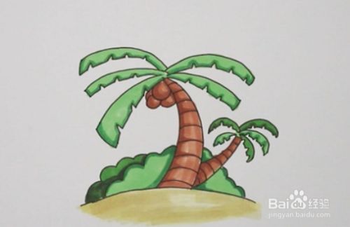 接着,在大的那棵椰子树上画上几个椰子,用线条绘出树干上的纹路,再在后面画上两片草丛就可以了。