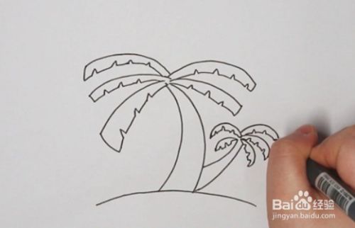 先画出椰子树一大一小两根树干,底部画上地面的线条,接着在树顶绘出椰子树的叶子,叶子长长大大的,边缘还有一些裂痕。