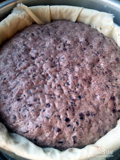 模具中铺上笼布,把面团倒入,表面弄平整,放入蒸锅,盖上锅盖,不要开火,发酵