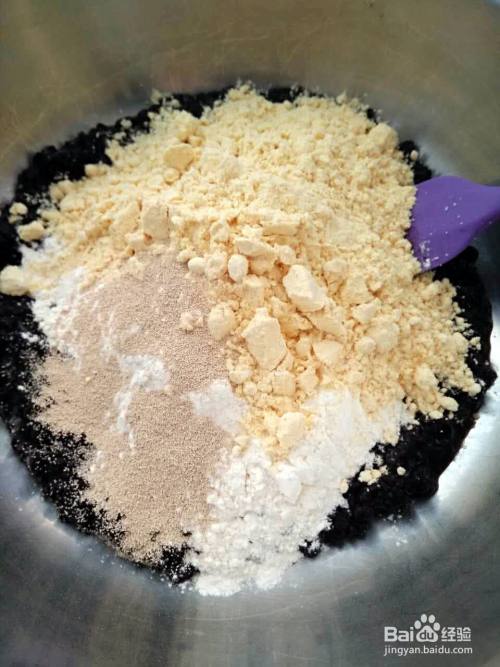 此时黑米粥已经是温的,快凉了,然后放入普面,玉米面,酵母,用筷子或硅胶铲拌成团