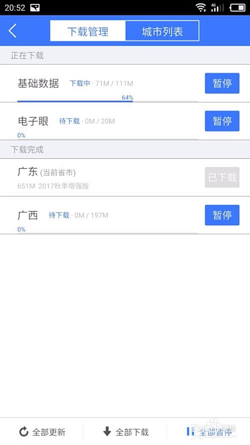 进来后,先下载基础数据,再下载【电子眼】,最后找出你所在的省份就将他下载。如果已经下载了,过了季度就可以点击更新,更新地图。