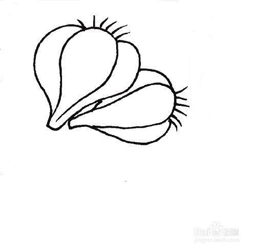 2、在右侧再画一个不规则的椭圆,围着椭圆将其阔宽并与左边的相交,在其底部画上一些小短线。