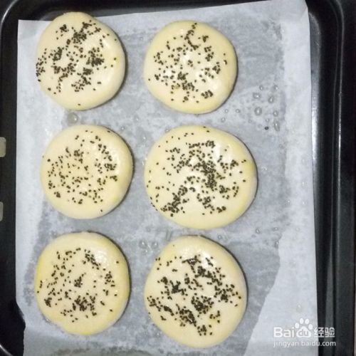 再用手按压成扁圆形,涂上蛋液,撒上黑芝麻,用牙签在饼上扎几个眼。