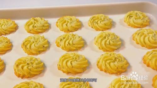 用裱花把材料均匀的挤到烤盘上,温度180度烤25分钟即可。